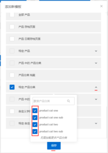 3、向下拉,找到【特定  产品分类】,点击右侧向下箭头,选定所以产品分类,保存即可