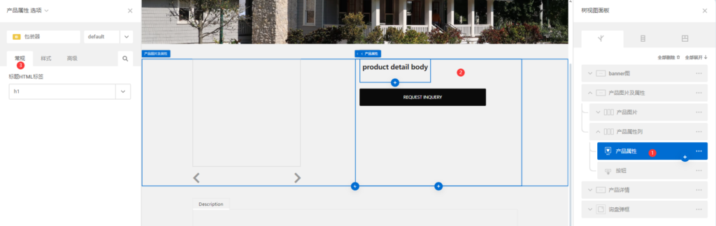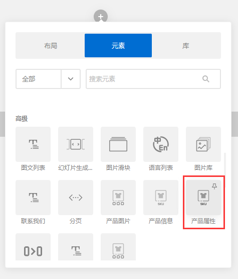 进入页面编辑,添加一个产品属性组件。产品属性组件一般用于产品详细页的产品属性展示。