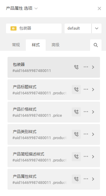 4、设置样式:包装器、产品标题样式、产品价格样式、产品类别样式、产品简短描述样式、产品属性样式。