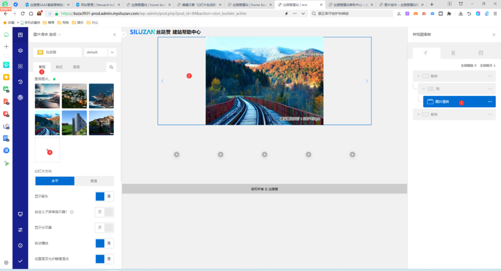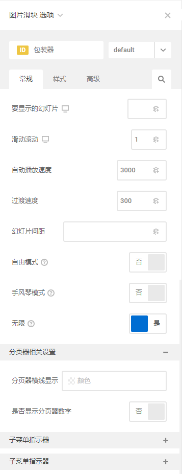 3、左侧操作区常规操作:图库图片(点击加号,可一次多选图片)、幻灯片方向、是否显示箭头、自定义子菜单指示器、是否显示分页器、是否自动播放、设置是否允许触摸滑动、要显示的幻灯片(点击右侧符号,选择动态数据)、滑动滚动(点击右侧符号,选择动态数据)、自动播放速度、过渡速度、幻灯片间距、自由模式、手风琴模式、是否无限、分页器相关设置(分页器横线显示颜色、是否显示分页器数字),子菜单指示器(选择图标)。