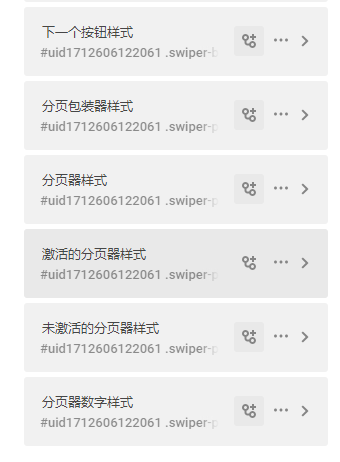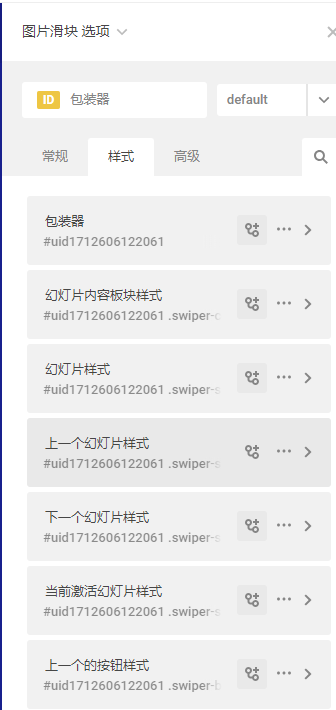 4、设置图片滑块样式:包装器、幻灯片内容板块样式、幻灯片样式、上一个幻灯片样式、下一个幻灯片样式、当前激活幻灯片样式、上一个的按钮样式、下一个的按钮样式、分页包装器样式、分页器样式、激活的分页器样式、未激活的分页器样式、分页器数字样式。