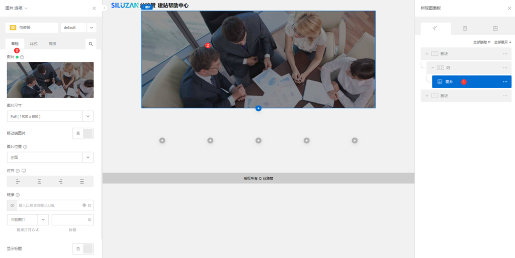 3、左侧操作区常规操作可设置图片组件的图片、图片尺寸(full/custom,选择custom可自定义高度和宽度)、移动端图片是否显示、对齐方式、链接及链接对齐方式、是否显示标题、是否显示描述、是否添加图片蒙层等。