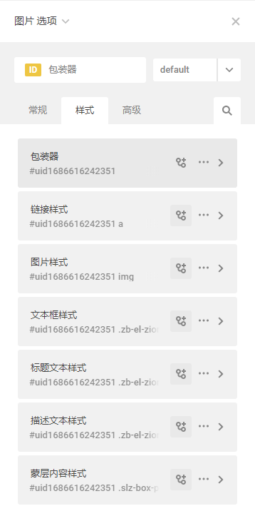 4、设置图片样式:包装器样式、链接样式、图片样式、文本框样式、标题文本样式、描述文本样式、蒙层内容样式。