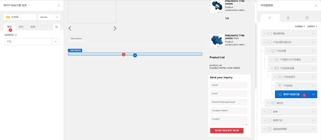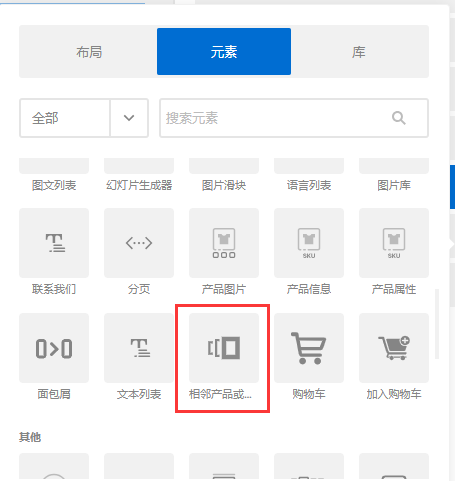 进入页面编辑,添加一个相邻产品或文章组件。此组件一般用于产品或文章的详细页的上一篇/下一篇产品或文章的展示。