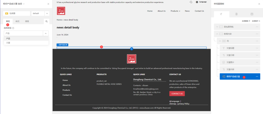 3、左侧操作区常规操作:选择类型(点击下拉,选择产品或文章)