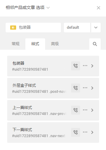 4、设置样式:包装器、外层盒子样式、上一篇样式、下一篇样式。
