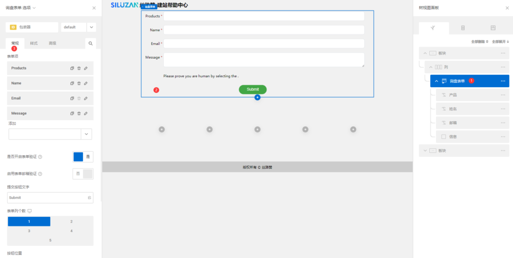 3、左侧操作区常规操作可设置表单项的增减、是否开启表单验证、是否开启表单邮箱验证、提交按钮文字、表单列个数 、按钮位置、标题位置、验证码对齐方式等。